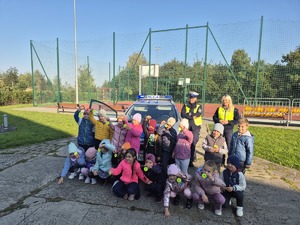 Dodano: 02.10.2025 Interaktywna lekcja bezpieczeństwa z udziałem Dzielnicowej i funkcjonariuszy Wydziału Ruchu Drogowego -