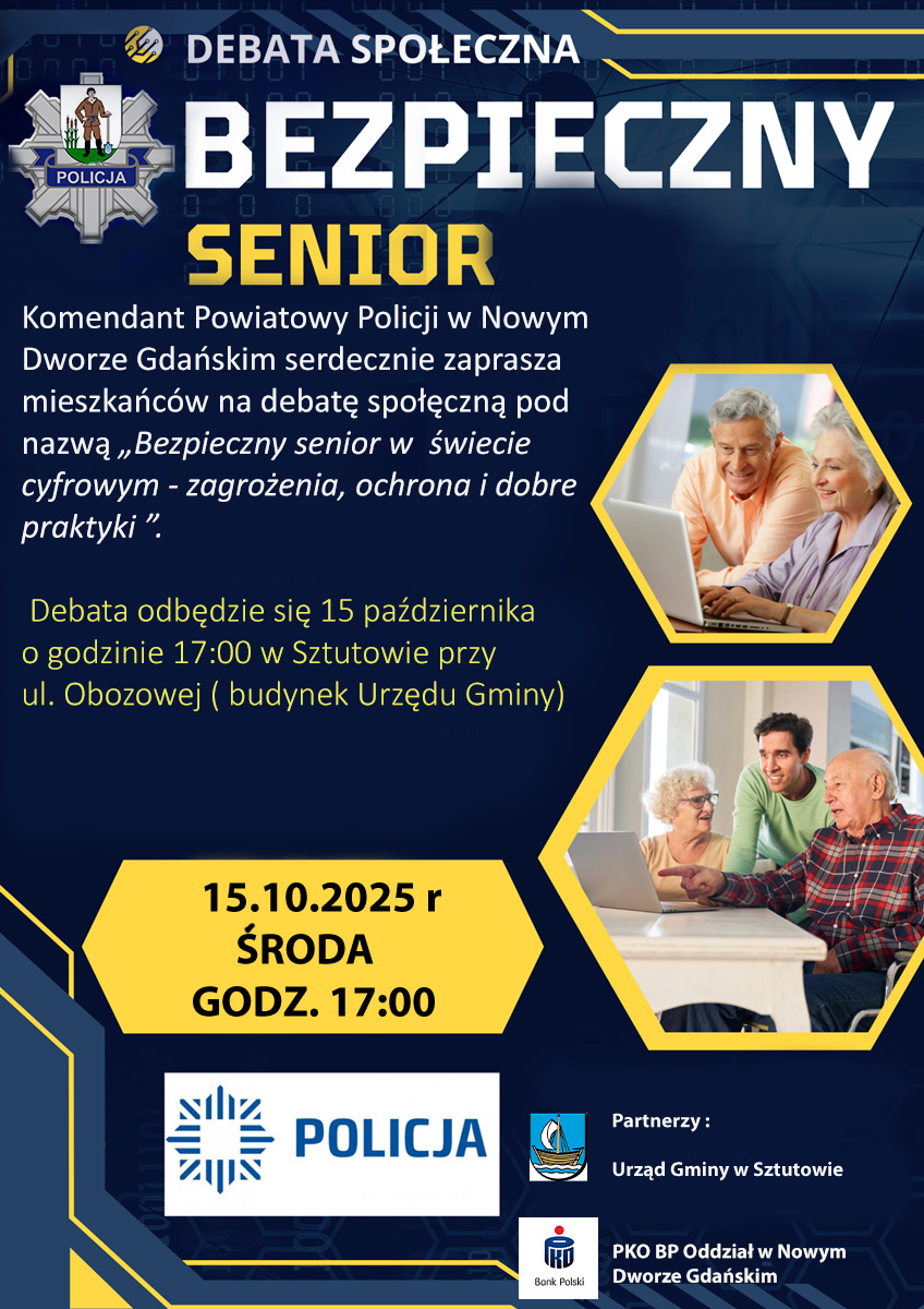 Komendant Powiatowy Policji w Nowym Dworze Gdańskim serdecznie zaprasza wszystkich seniorów z gmin Sztutowo, Stegna i Krynica Morska na debatę poświęconą bezpieczeństwu w bankowości internetowej. Spotkanie odbędzie się 15 października 2025 r. (środa) o godz. 17:00 w obiekcie kulturalno-sportowym przy ul. Obozowej 16 w Sztutowie.