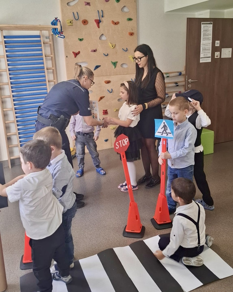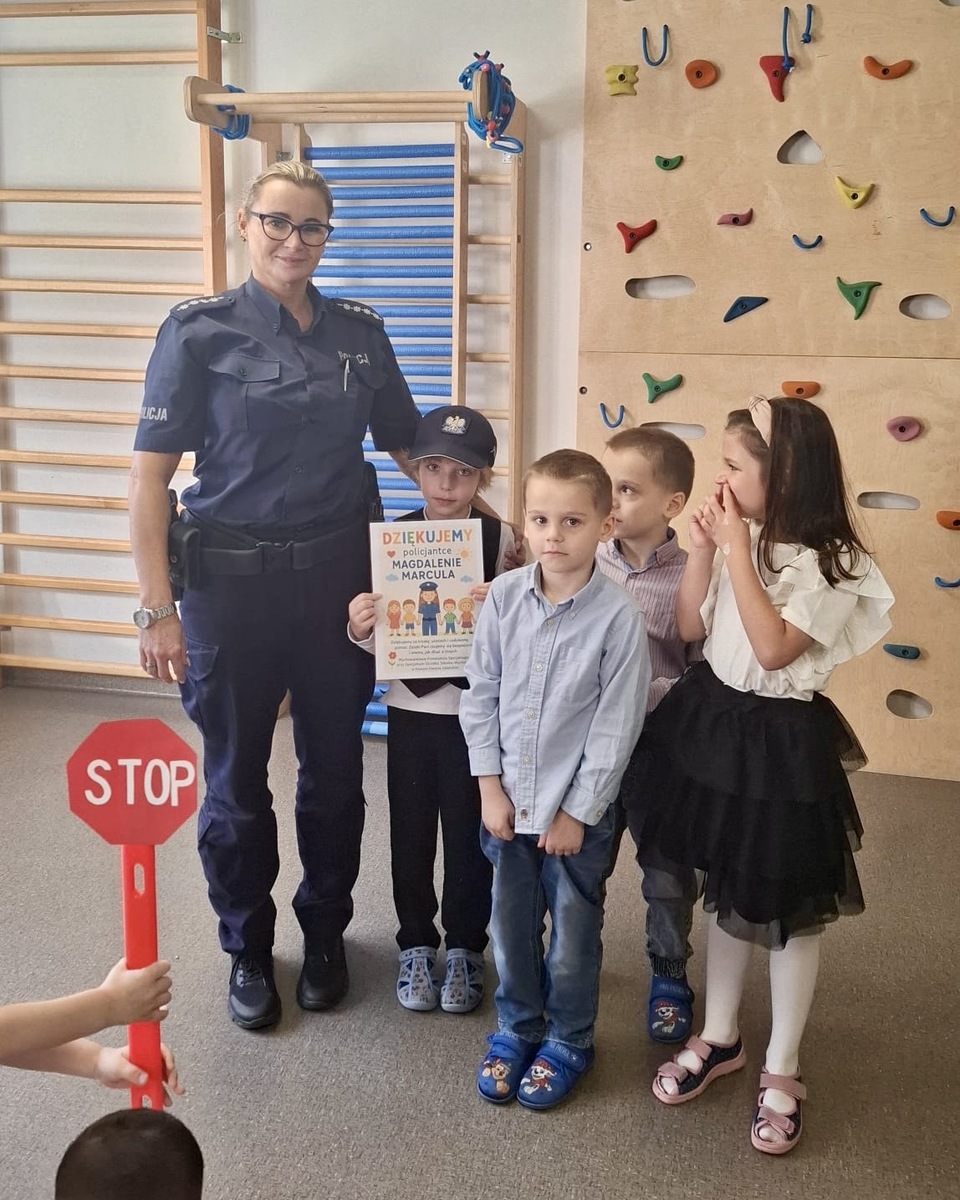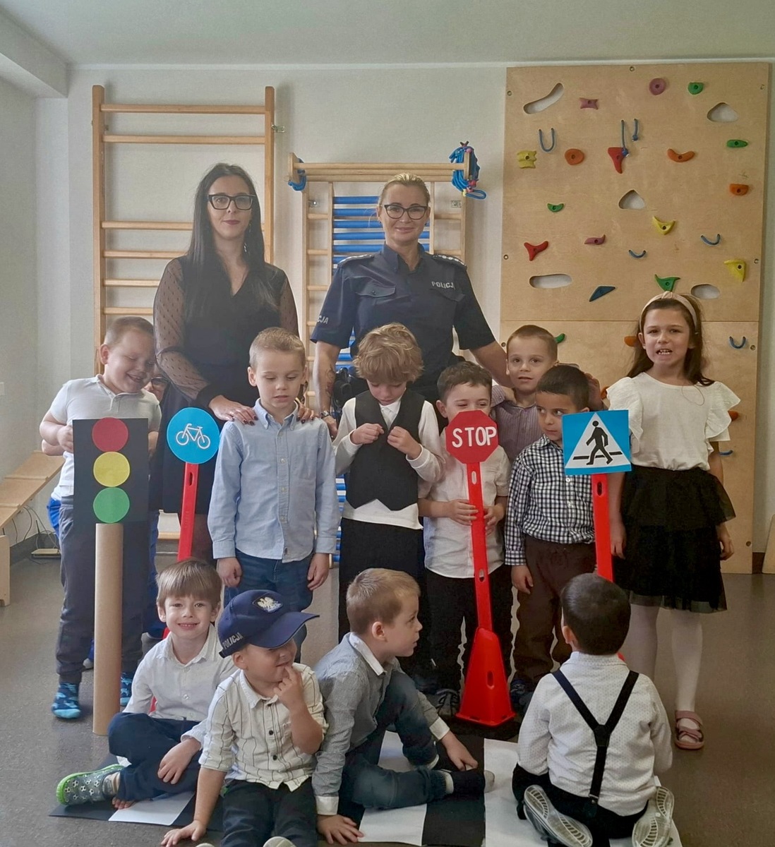 Podczas spotkania w placówce funkcjonariuszka w przystępny i atrakcyjny dla najmłodszych sposób przypomniała zasady bezpiecznego poruszania się po drogach. Dzieci dowiedziały się jak prawidłowo przechodzić przez jezdnię, co oznaczają podstawowe znaki drogowe oraz jakie znaczenie mają kolory świateł sygnalizacji. Przedszkolaki aktywnie uczestniczyły w spotkaniu, zadając pytania i chętnie dzieląc się swoimi spostrzeżeniami. Tego rodzaju działania mają na celu kształtowanie wśród najmłodszych właściwych nawyków i postaw, które w przyszłości przyczynią się do zwiększenia bezpieczeństwa wszystkich uczestników ruchu drogowego.