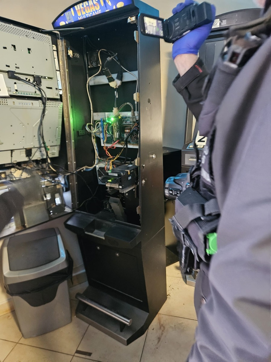 W trakcie wspólnych czynności funkcjonariusze ujawnili lokal, w którym prowadzona była nielegalna działalność hazardowa. Podczas przeszukania zabezpieczono 6 automatów do gier hazardowych oraz gotówkę. Łączna wartość zabezpieczonego mienia przekracza 74 tysiące złotych.